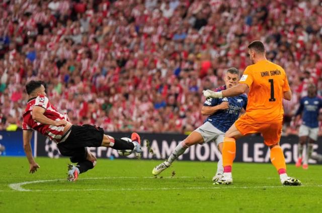 一帮巴斯克人挑大梁的英格兰球队访问巴斯克俱乐部,想想这画面你都觉得诡异。阿森纳在头一个小时里略占上风,毕竟阵容造价是对方的47倍,你没看错。但无论是埃泽领衔的地面渗透,还是哲凯赖什的空中优势,都对毕尔巴鄂没有实质威胁。马杜埃凯的底线倒三角,埃泽没来得及扣扳机,球就被解围;廷伯的传中找到了哲凯赖什,可惜他鱼跃冲顶擦着门柱飞出底线。赖斯操刀定位球,哲凯赖什后点一敲,还是打偏。阿尔特塔唤出特罗萨尔和马丁内利,改变比赛走势。